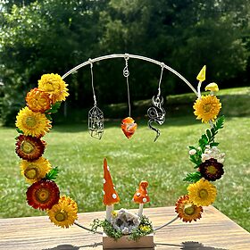 Bright and Sunny Vibes Floral and Mushroom Standing Hoop Decor with Wood Base