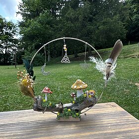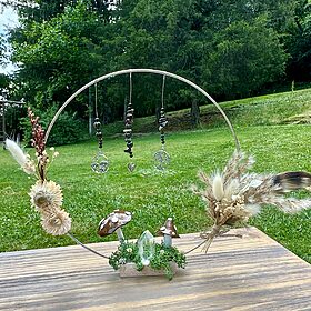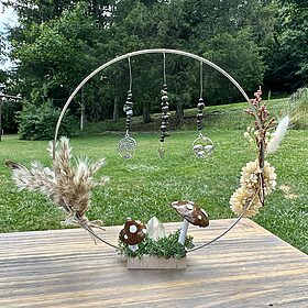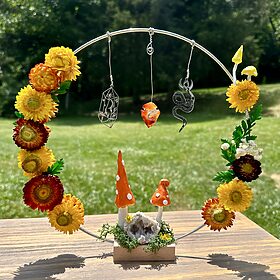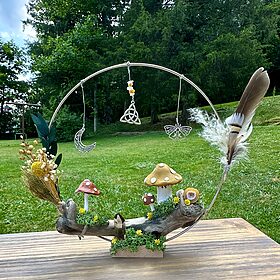 Standing Decorative Hoop with Handmade Clay Mushrooms, Dried Flowers and Crystals